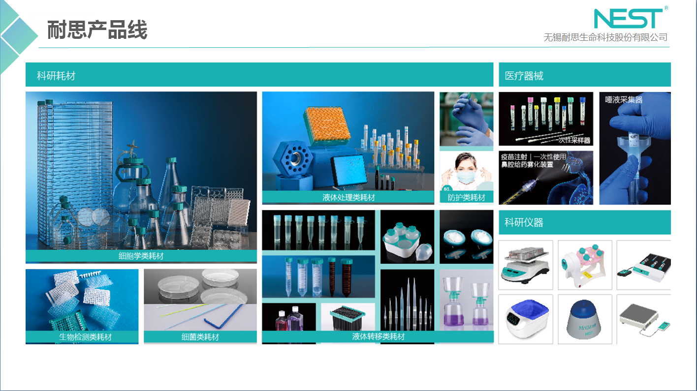 耐思NEST品牌主要產(chǎn)品分為:科研耗材、醫(yī)療器械和體外診斷三大類。耗材類根據(jù)應用領域不同,可細分為六大類:細胞類耗材、液體處理類耗材、液體轉移類耗材、生物檢測類耗材、細菌類耗材、防護類耗材。
